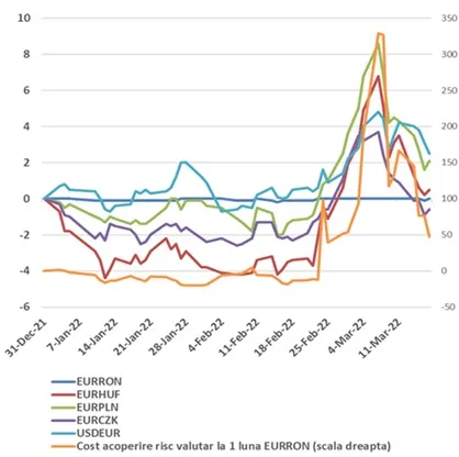 Trecând peste efectul de sentiment și peste evaluarea temporară a riscului geopolitic, rămâne totuși impactul economic al războiului militar și, în special, economic, a cărui acțiune perversă afectează o rată a inflației aflată deja în plină ascensiune antebelică, și periclitează în același timp și relansarea economică post-pandemie în special în spațiul european. Având de ales între două rele – a nu face nimic și a risca astfel să scape inflația de sub control, respectiv a strânge cureaua monetară și a crește dobânzile cu riscul de a gâtui creșterea economică –, băncile centrale par să încline din ce în ce mai mult înspre combaterea inflației, probabil și datorită magnitudinii fenomenului și asimetriei prin care lovește preponderent în populația mai vulnerabilă. Banca centrală din SUA (Fed) a și făcut primul pas de majorare de dobândă, iar Președintele Fed-ului a dat clar de înțeles că vor urma și alte majorări și că focusului său este pe ”restabilirea stabilității prețurilor” (a se vedea transcrierea speech-ului său integral de săptămâna trecută aici). Banca Centrală Europeană pare mai cumpătată în elanul său de combatere a inflației, dar ancitipațiile sunt că și aceasta va recurge la măsuri mai restrictive, existând șanse să nu mai vedem dobânzi negative la EUR de anul viitor. Băncile centrale din Europa Centrală și de Est au fost chiar mai proactive decât cele din țările dezvoltate, dobânzile de politică monetară dirijate de către acestea crescând la niveluri cuprinse între 2,5% în România și 4,5% în Cehia, poate și pentru că în regiunea noastră inflația e mai ridicată (8%-11%) și riscă mai ușor un derapaj către endemizare.